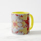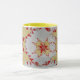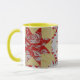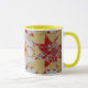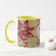 Vintageamerikantäcket, räcker - gjort rött och gult i det åtta pekade stjärnamönster som kallas ibland också snowflakemönster. Detta antika mönster för familjheirloomtäcket (circa 1919) gör en färgrik mugg som hedrar detta speciella hantverk.