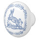 Den här mjuka, blå designen på en skarp vit bakgrund inspirerades av antika lermönster som Delft och Dedham. Motiven på den här knoppen är bland annat en kanin med leapande kanin och en leafy gräns. En underbar accent för dina skåp, hantverksprojekt, smyckeskrin eller möbler. Utformningen har en vintage-/rustik-/land-Fransk-känsla och kompletterar eventuell blå och vit dekoration. Nyfiken originalgrafik och design av Tuzi Williams. Finns i lämnat versioner och versioner som är vända mot högerna.
