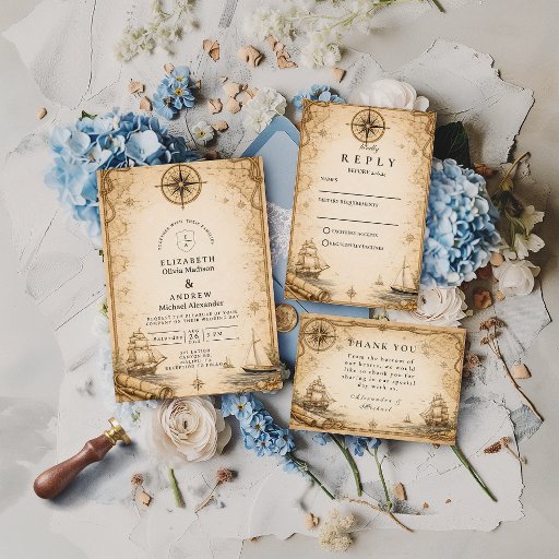 This elegant nautical wedding design features classic maritime elements including a compass rose, knotted rope, seashell details, and a timeless anchor accent. Set against a soft neutral background with navy and gold touches, the composition feels refined, coastal, and romantic without being overly themed. Perfect for seaside weddings or couples who love subtle nautical symbolism with a polished, timeless aesthetic.