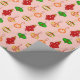 Omslagning pappert i mönster av olika antika Julgran-prydnadsföremål, i djupt rött, mörk grönt, mjukt guld och rosa, mot en mjuk bakgrund för persikor och rosa