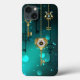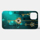 Guld, antika nycklar med växlar och dialer hänger på guld-kedjor på ljusstrålande gröntens bakgrund.