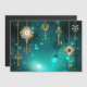 Guld, antika nycklar med växlar och dialer hänger på guld-kedjor på ljusstrålande gröntens bakgrund.