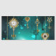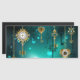 Guld, antika nycklar med växlar och dialer hänger på guld-kedjor på ljusstrålande gröntens bakgrund.
