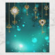 Guld, antika nycklar med växlar och dialer hänger på guld-kedjor på ljusstrålande gröntens bakgrund.