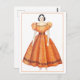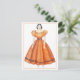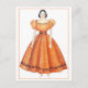 Det här vykortet har en skiss/teckning av en antikisk Viktoriansk docka i en orange klänning.