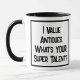 Lustigt slogan på en mugg som säger "Jag värdesätter antikviteter. Vad är din toppen talang?" Två Tone Mugg för en antikviteter, en antikisk köpare eller en antikviteter. Svart och vit fet text.