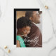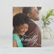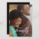 Ett elegant kort för bröllopsanmälan med ert favoritfotografi från förlovningen, överlagt med "Äntligen" i elegant vit skrivstil och datum för brölloppsdagen. Baksidan är i enfärgat svart med detaljer om bröllopet i svart.