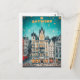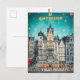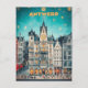 Ett vackert detaljerat vykort som fångar den magiska charmen i Antwerpen, Belgien, med stora historiska byggnad med invecklade fasader och en gyllene astronomisk klocka i centrum. Kvällens glor med varmt ljus som kommer från butiksfönster och bostäder, skapar en mysigt och inbjudande atmosfär. Ovanför detta läggs ett drömt teal himmel med gyllene celestial inslag. Med stjärnor, klockor och visuella motiv som tillför en surrealistisk och konstnärlig beröring till sammansättningen. Denna fantastiska konst representerar perfekt elegansen, kulturen och den tidlösa skönheten i antwerps arkitektoniska arv.