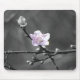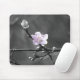Denna mus vadderar särdrag en rosa körsbärsröd blommar mot en naturlig bakgrund i svartvitt.