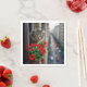 Ett flytande tabby katt med slående grönt ögon-peers ut från ett stiga upp lägenhetsblad med en sjudande blomstrå med röda petunia-blommor