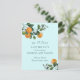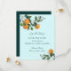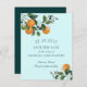 Elegant och livfullt Spara Datum-kort med en färgrik illustration av en orange trädgren med blommande blommor, apelsiner och blad. Denna färgglada design är bra för ett citrus-tema bröllop, sommarbröllop, vårbröllop, trädgårdsbröllop, botaniskt bröllop eller utomhusbröllop. Färgpaletten är mjuk och trendig. Det övergripande utseendet är modernt men ändå stilfullt och elegant, med en lantlig touch.