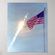 Den amerikanska flagga förebådar flyget från Apollo 11, människans första månlandning uppdrag. Rymden Apollo 11 Saturn V fordon lyfte med astronauterna Neil A. Armstrong, Michael Collins och Edwin E. Aldrin Jr. kl. 9.32 EDT från KSC's Launch Complex 39A. Under den planerade åttadagarsuppdrag kommer Armstrong och Aldrin att sjunka i en Lunar Module (LM) till Måne yta medan Collins tränger över i kommandomodulen. De två astronauterna ska tillbringa 22 timmar på Måne, inklusive två och en halv timme utanför LM. De kommer att samla in prover av månmaterial och använda vetenskapliga experiment som kommer att överföra data om månmiljön. De kommer att ansluta sig igen till Collins i kommandomodulen för att återföra resa till jorden.