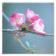 Ett foto av ett äpple träd gren med rosa äppelblommar på blå/grått-bakgrund.