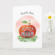 Ett glansigt, ljusrött äpple förvandlas till ett magiskt litet skolhus, mot en tidigt-morgon himmel. Ursprunglig illustration av Noël Snö.