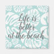 Mjuk akvakblått och vitt magnet med en vacker utskrift av tropiska löv. Texten säger: "Livet är bättre på stranden."