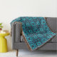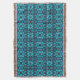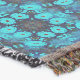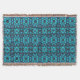 Ett symmetriskt, kaleidoskopiskt mönster har klara blåskuggor med röda prickar och mörk konturer. Den invecklade konstruktionen bildar en upprepande motiv som skapar en mätande visuell effekt.