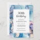 Trendig och modernt Födelsedagsfest inbjudan med akvafblått, lila och guld alkohol bläck mönster och motsvarande baksida. © Mini Moi-utskrifter