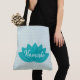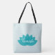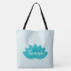 Stilren yoga tote väska med tryck över hela ytan i ett blå-vitt prickmönster, med grafik av en akvatisk lotus siluett i mitten. Vit text läses Namaste och kan anpassas till vad du vill.