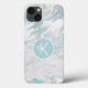 Elegant iPhone-fodral med ett vitt och akvablått marmorerat mönster. Ett akvamarinblått cirkulärt textområde i mitten av fodralet har ett vitt monogram i skrivstil. Personalisera monogrammet med en bokstav, för dig själv eller som en fin presentidé till henne.