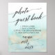 Denna akva- och guldvattenfärgade strandfotografis gästboksskylt är perfekt för en tropisk bröllopsfest. Den enkla och moderna designen har en fantastisk turkos, teal och ljusblå vattenfärg med en mjuk guldglans som påminner om sand och hav. Den är ihopparad med vacker elegant kalligrafi.