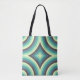 Den här bilden har en slående geometrisk mönster som består av koncentriska cirklar som korsar varandra för att skapa en diamantmotiv i mitten. Färg övergår harmoniskt från vattenblått till mynt grönt, gränsad till mörk grått linjer, vilket ger en levande känsla av rörelse och djup. Den totala effekten känns både retro och modern, påminner om psykodelisk konst och mönster i mitten av århundradet