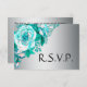 Contemporary silver och akvatiska bröllop OSA har ett söt aka (eller teal - med ett tips på rosa) bukett med rosor i det övre lämnat handhörnet. I bakgrunden finns det en glansig metallbas i silver. På baksidan finns också en liten akva bukett med rosor vid grund på kortet.
