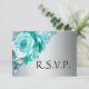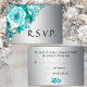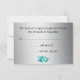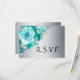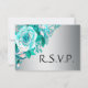 Contemporary silver och akvatiska bröllop OSA har ett söt aka (eller teal - med ett tips på rosa) bukett med rosor i det övre lämnat handhörnet. I bakgrunden finns det en glansig metallbas i silver. På baksidan finns också en liten akva bukett med rosor vid grund på kortet.