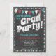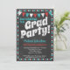 En funky kritskiva aqua och röd examen fest inbjudan med tjock text "Grad Fest!" högst upp med kritskivebakgrund, flaggor och en söt prickig kant.