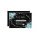 This elegant wedding RSVP card features a silver geometric frame decorated with aqua and silver floral bouquets on a black background. The customizable text combines silver gray whimsical handwriting and copperplate fonts. The reverse side is solid black.