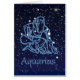 Kort med zodiaksymbolen för Aquarius i mjuk blått silver, överdragen med stjärnorna i konstellationen, mot bakgrund av himlar från djup midnattsblå till svart.
