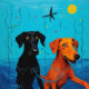 "Aquatic Duo of Joy" - Surreal Colorful Hundar. Ett par färglöst hundar, en svart och en orange, bas i en lekfull vatten-inställning. Den surrealistiska teckningens livliga nyanser av svart, blått och orange lägger till i de charmerande uttrycken och skapar den som ett utmärkt biet för djurälskare. Labrador och Vizsla hundar.