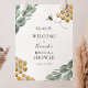 Välkommen gäster till din bröllopsfest med denna vackra affisch med akvarell bikakor eukalyptusblad och en gyllene bin. Lägg till hedersgästens namn, datering för bröllopsfest och anpassad välkomsttext med hjälp av fälten.