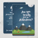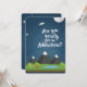 Platt ton/ikon konst stil inbjudan med utomhus, berg, natt himlar, måne, raketer, tält och ord "Är du redo för ett Äventyr?" och "JA!" på baksidan med utrymme för händelseinformation.