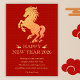 önskemål för välstånd i Lunar nyår 2026 - Häståret med detta elegant rött och guld hälsningskort. En häst som föder upp zodiak i ornate linworking sitter på en lyckligt röd bakgrund ovanför budskapet "Gott nytt år 2026". Ett tidslöst val för familj, vänner, kunder eller företagsförsändelser. Obs! Tryckt guld är en grafisk effekt, inte metallfolie.