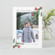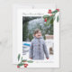 Ett modernt julkort med gott om vitt utrymme. Ditt favoritfoto i porträttformat tar centerplatsen, accentuerat med två gröna och röda vattenfärgade bärgrenar. Rubriken lyder "Ära åt Gud i höjden" (hälsningen från änglarna i julberättelsen) med en beskuren grön typsnitt, som är redigerbar. Avsluta med ditt efternamn. Baksidan visar ett vattenfärgsmönster med bär och grenar på en beskuren grön bakgrund.