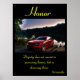 Mot en lugn insjö vid skymning ställs en livfull röd sportbil som fångar uppmärksamheten, dess blanka finish subtilt upplyst under en gradient himmel som övergår från skymning till natt. Omgivande frodig grönska och mjukt reflekterande träd skapar en atmosfär av lugn elegans. "Ära" visas framträdande i elegant gul kursiv högst upp, symboliserar värdighet och inspiration. Nedan flyter Aristoteles motiverande citat — "Värdighet består inte i att besitta heder, utan att förtjäna den" — graciöst i ett sofistikerat typsnitt, inramat av stilla reflektioner. Denna genomtänkta komposition blandar elegans, styrka och naturlig skönhet för att inspirera till reflektion och ambition.