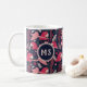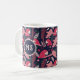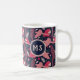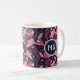 Ara Parrot Red Rosa Teckning Tropical Löv Mönster Monogram Mugg. Ara mönster mot mörk blått bakgrund med tropiska löv i grönt, rött och beige färg. Digital handritad illustration. Lägg till ditt monogram.