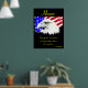 Mot en djärv svart bakgrund fångar en vild amerikansk havsörn uppmärksamheten med sin intensiva blick och skarpa drag. Bakom den vajar den livfulla amerikanska flaggan dynamiskt och fyller scenen med röda, vita och blå nyanser. Ordet "Honor" lyser högst upp i elegant gul kursiv stil, symboliserar värdighet och respekt. Nedanför tillför Aristoteles djupgående citat — "Värdighet består inte i att besitta hederstitlar, utan i att förtjäna dem" — en eftertänksam touch. Denna visuellt fängslande design firar styrka, visdom och patriotism i en harmonisk komposition.