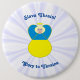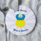 Ukrainska flaggan är blå upptill och gul nedtill. Här har vi en ängel iklädd Ukrainas blå och gula flagga. Bakgrunden är vit, solstrålar. Ovan, i blå bokstäver står SLAVA UKRAINI. Nedan, i samma färg står orden ÄRA TILL UKRAINA. Visas här på en extra stor knapp. Du kan välja mellan olika storlekar för att passa ditt behov och din budget.