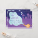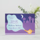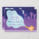 En underbar och roligt arabisk nattmagiska lampa födelsedagsfest inbjudan. Inbjudan innehåller en arabisk skylt och en magisk lampa i förgrunden och en måne och stjärnor i bakgrunden. Inbjudan är lila och blå för att göra den magisk.