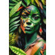 "Arayúna" Jungle Canvas - Kvinnor i Amazonas. Hennes kropp, täckt i mönster av färglös färg, spegel är regnskogens naturliga arv. Hon är en surrealistisk arbetsyta, hennes essens vävs in i vildens pulserande tekonst. Hon fångar med en blick av inkvisiositet.