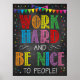ARBETA HÅRT OCH VARA NICE FÖR MÄNNISKOR! En underbar poster att hänga i ett klassrum eller skolkontor av alla slag för att påminna barn att arbeta hårt och vara snäll! Två enkla regler som går långt! Har en öga-fångstdesign med roligt, ljus och glad färg.
