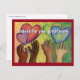 Postkortets meddelande lyder: "Tack för ditt fantastiska arbete." Mångrasistiska händer sträcker sig efter färgglada hjärtan i en regnbåge för att fira DEI eller mångfald, jämlikhet och inkludering. Konsten skapades med akvarell och pastellkritor på papper.