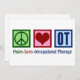 Ett snyggt julkort för arbetsterapeuter med en grön fredstecken, rött hjärta och OT skrivet i blått på en blå bakgrund. Arbetsterapi är en så viktig yrke. Det hjälper både vuxna och barn med sinnesstimulering.