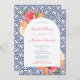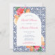Cute kumquats och citruscitrusfrukter som förstärks av skarp blommigt av rosa kontrasterar för dessa trendmässiga Inbjudningskort för möhippa. Den blå och vita bakgrunden mönster på framsidan och baksidan tas från en vintage Azulejo (blå vit ruta).