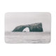 En stor, naturlig sten-ark står i stor utsträckning i mitten i ett lugn hav. Arken bildas av en stor, mörk grått sten med en naturlig öppning som skapar en perfekt arkway. Sten är täckt av en ljust grönt moss och lichen, som tillfogar färg en aning till det annars grått-landskapet. Himmel är en blek grått, vilket tyder på en grumlig dag.