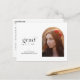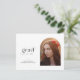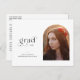 Det här moderna vykortet för svartvit studenten-meddelande har trendig-typografi och en bågformad bild. På framsidan skrivs "grad" i ord i unik form med studenten nedan. Vid grund lägger du till student namn och skolan. Typografin är svart mot en chic vit bakgrund. Till typografens höger visas ett bågformat foto. På baksidan av vykortet kan du lägga till ett meddelande till mottagare och/eller studentfest.