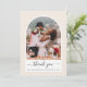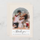 Minimal och elegant bröllop tackar er kort för nylweds som visar ditt foto i ett bågat bild ram mot en gräddbakgrund, "tack" i ett modernt manus i snyggten och er herr & fru namn och bröllop-dejt i enkel typografi. På motsatt sida kan du anpassa ett tackmeddelande och lägga till ditt första namn som en namnteckning.