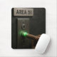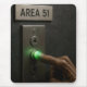 En mörkbrun skrynklig utomjording-hand trycker på en lysande grön knapp märkt 'Area 51' på en hisspanel, vilket väcker nyfikenhet om platsens hemligheter