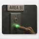 En mörkbrun skrynklig utomjording-hand trycker på en lysande grön knapp märkt 'Area 51' på en hisspanel, vilket väcker nyfikenhet om platsens hemligheter